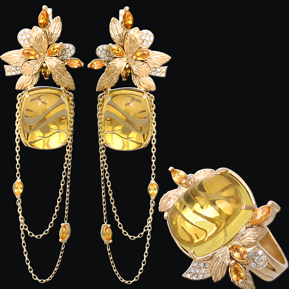 Золото(585), лимонный кварц, цитрины, сапфиры, бриллианты.