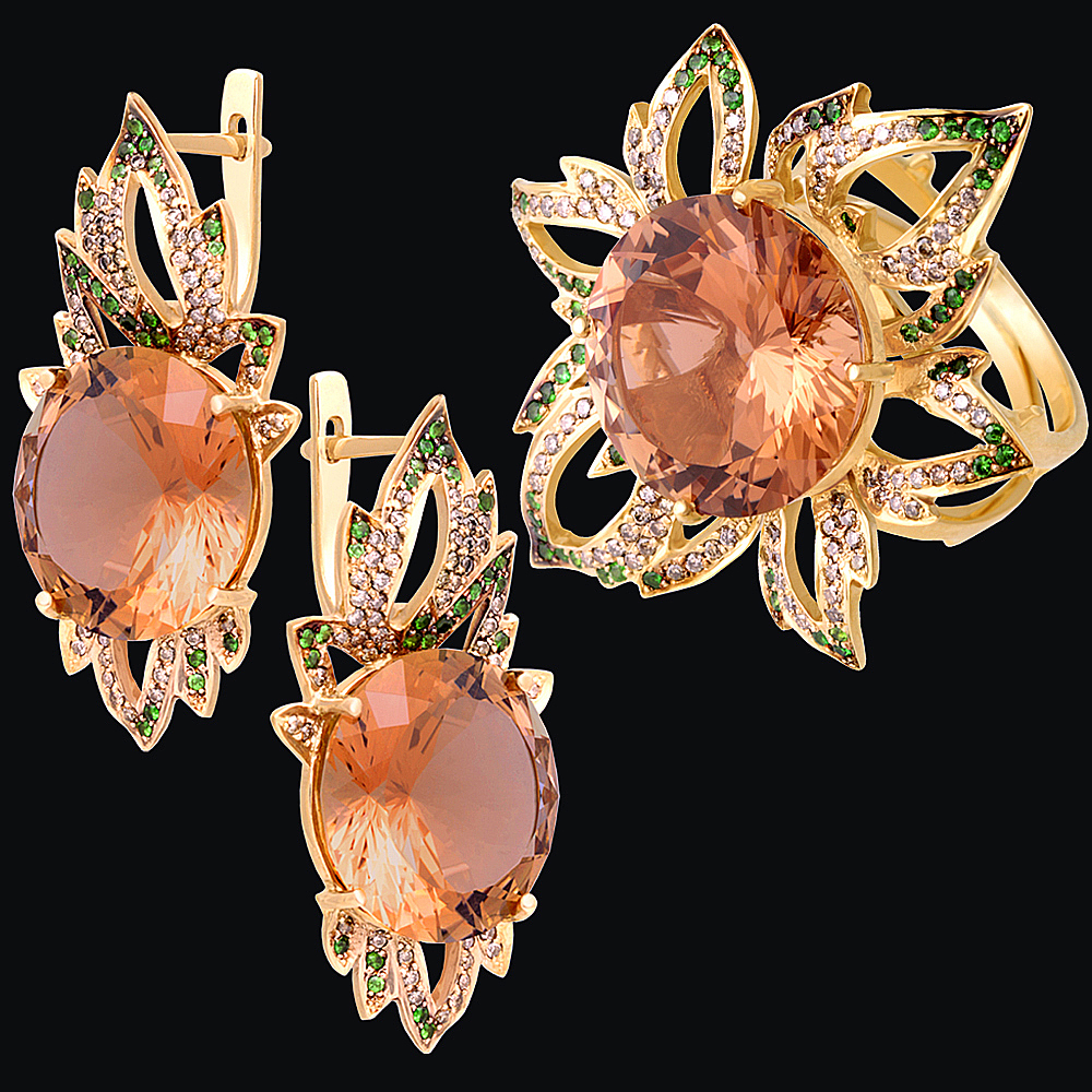 Золото(585), топаз винный, бриллианты коньячные, тсавориты.