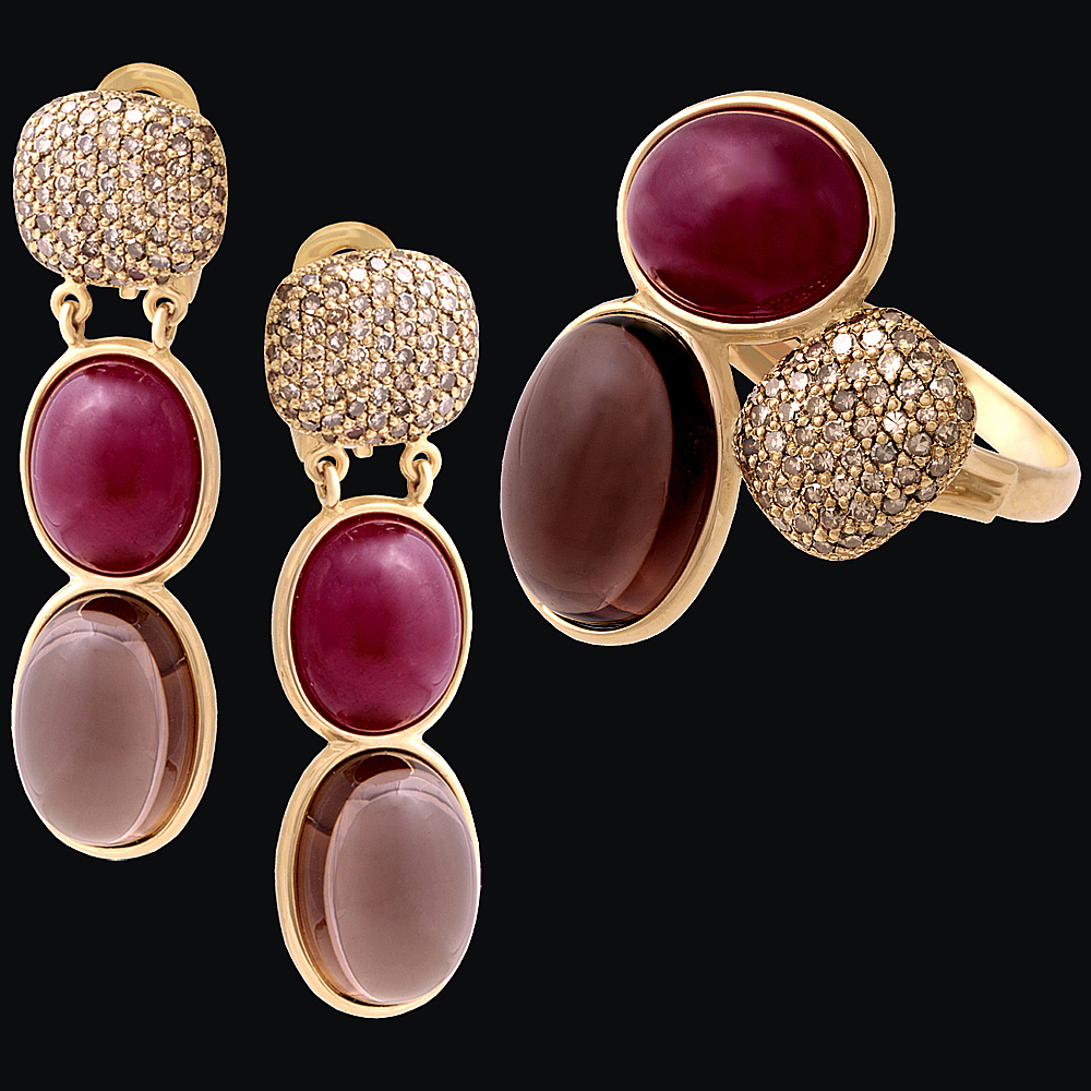 Золото(585), рубины, дымчатый кварц, бриллианты коньячные.