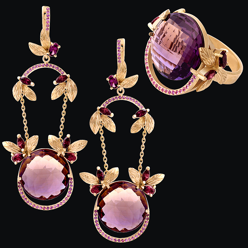 Золото(585), аметрины, гранаты, сапфиры.