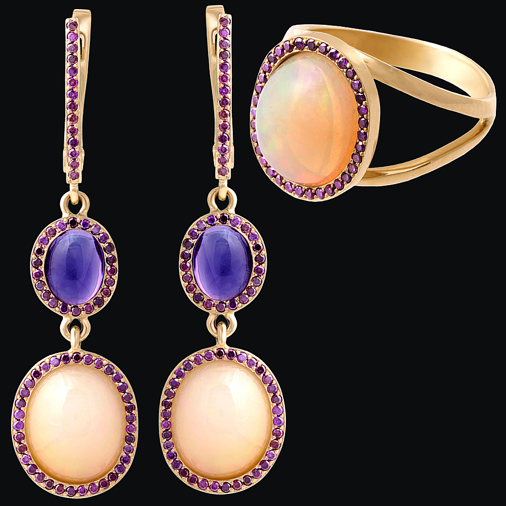 Золото(585), опалы, аметисты, цветные бриллианты.