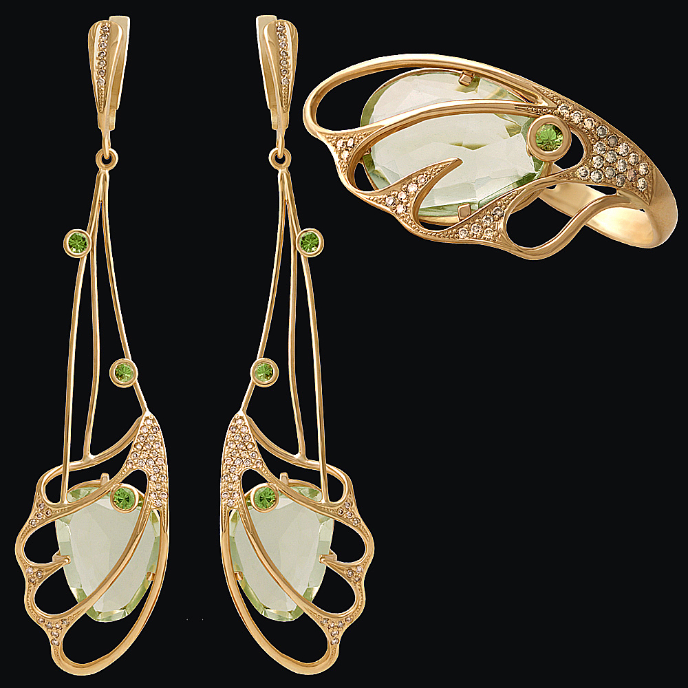 Золото(585), празиолиты, тсавориты, бриллианты.