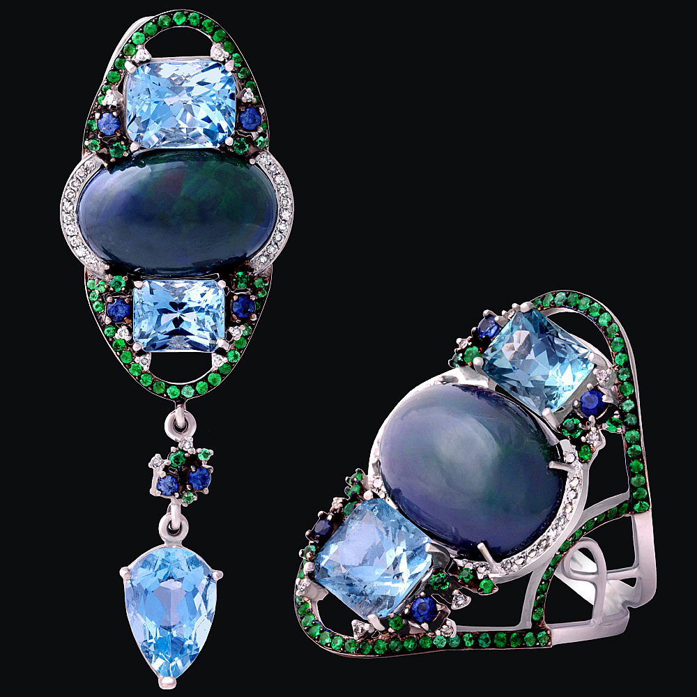Золото(585), опалы, аквамарины, бриллианты, изумруды, сапфиры.