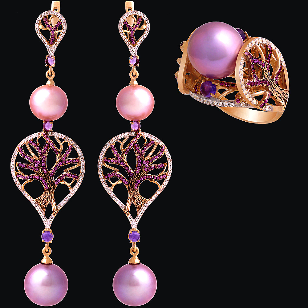 Золото(585), жемчуг, аметисты, родолиты, сапфиры.