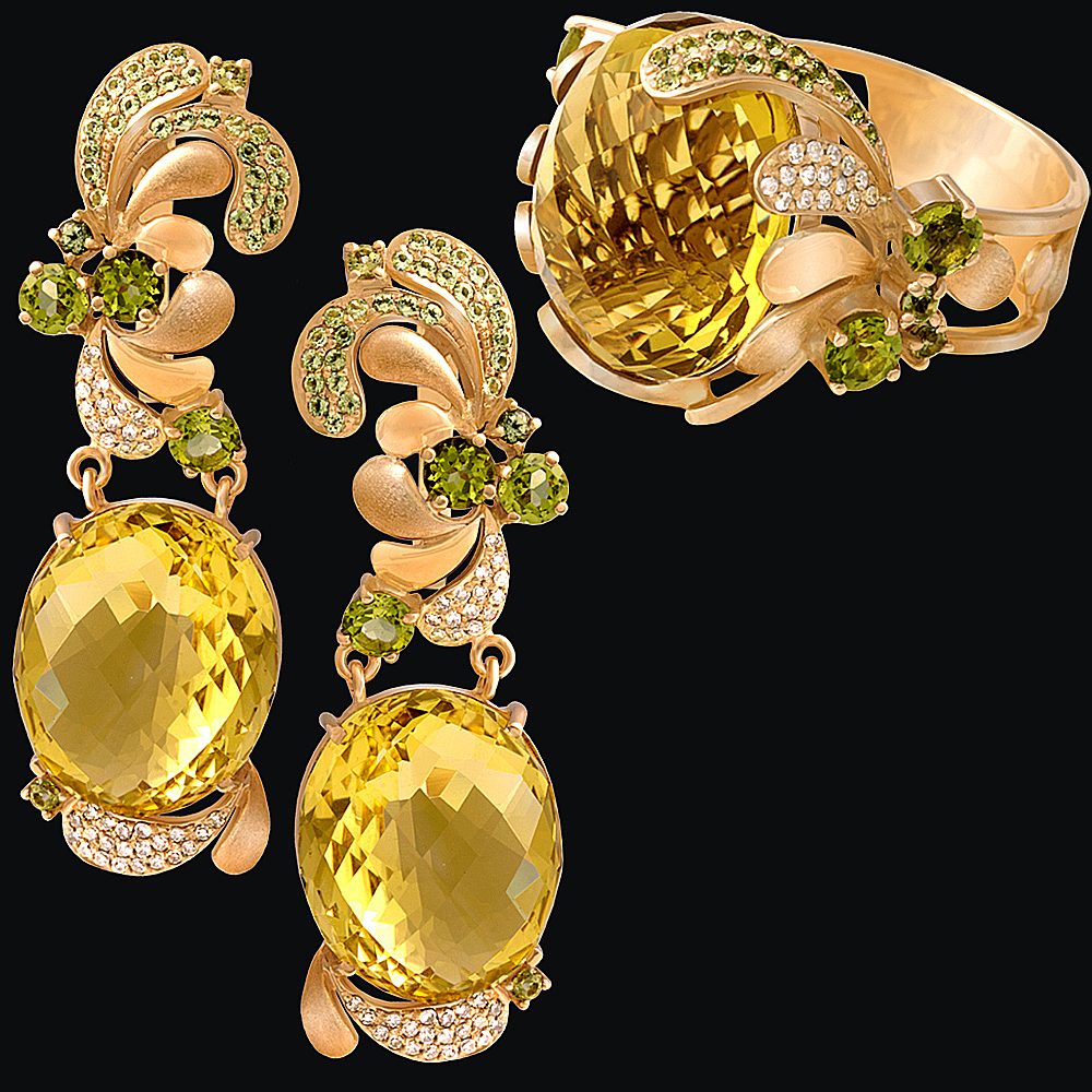 Золото(585), кварц лимонный, хризолит, перидот.