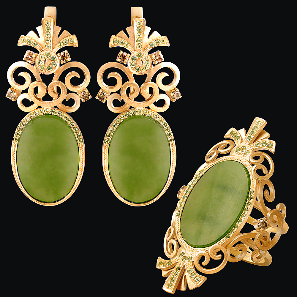 Золото(585), нефрит, перидот, бриллианты.