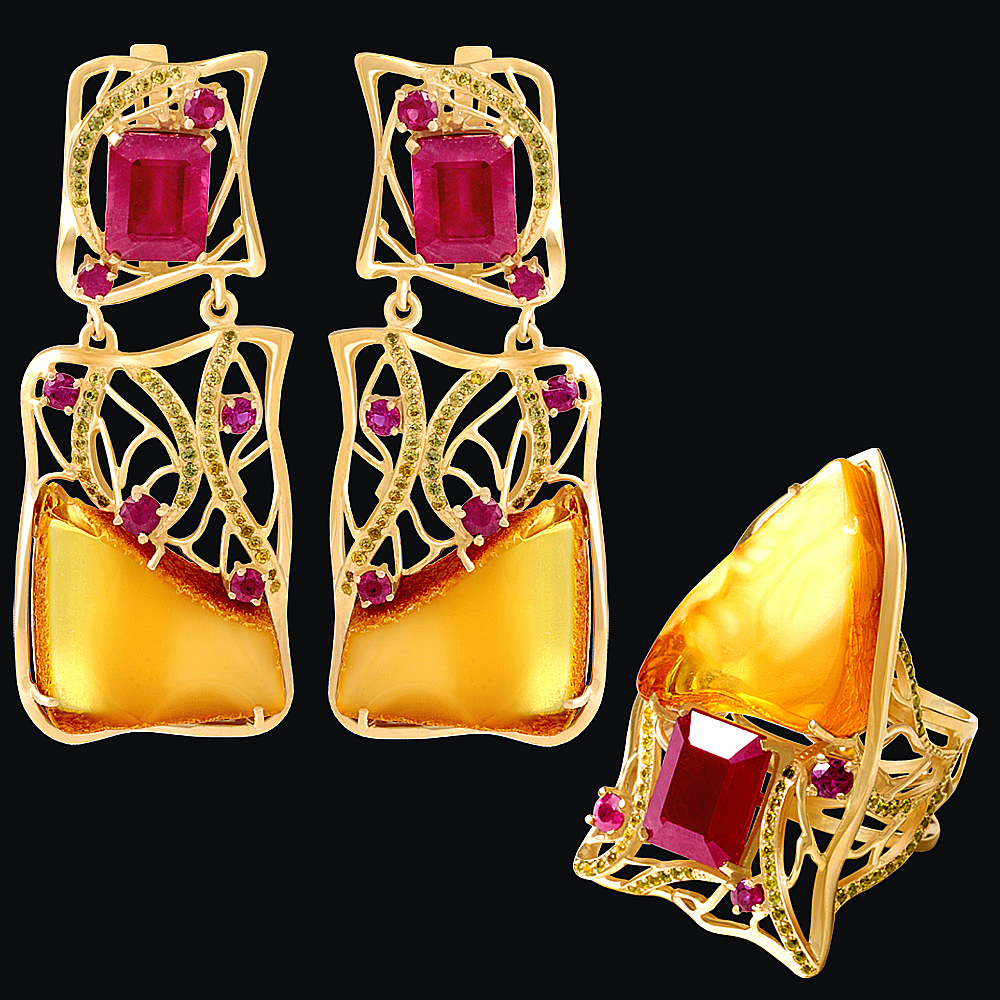 Золото(585), янтарь, рубины, сапфиры.