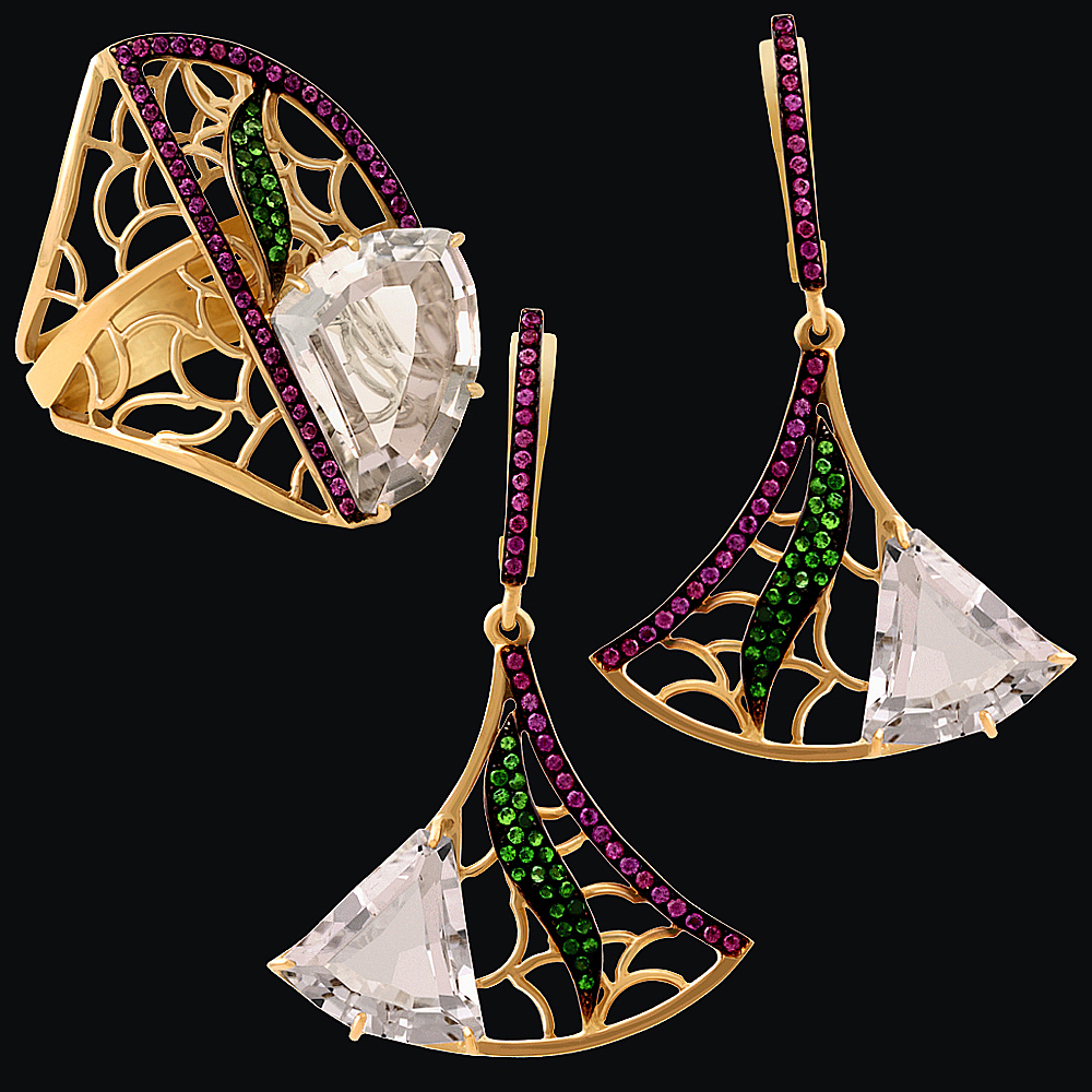 Золото(585), горный хрусталь, родолиты, тсавориты.