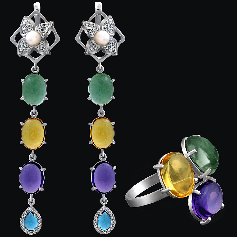 Золото(585), аметисты, цитрины, жемчуг, топазы, бриллианты.
