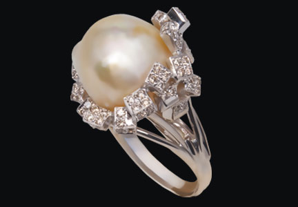 Желтое золото, жемчуг, бриллианты.