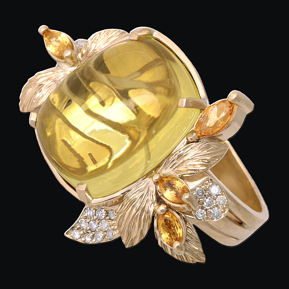 Золото(585), лимонный кварц, цитрины, сапфиры, бриллианты.