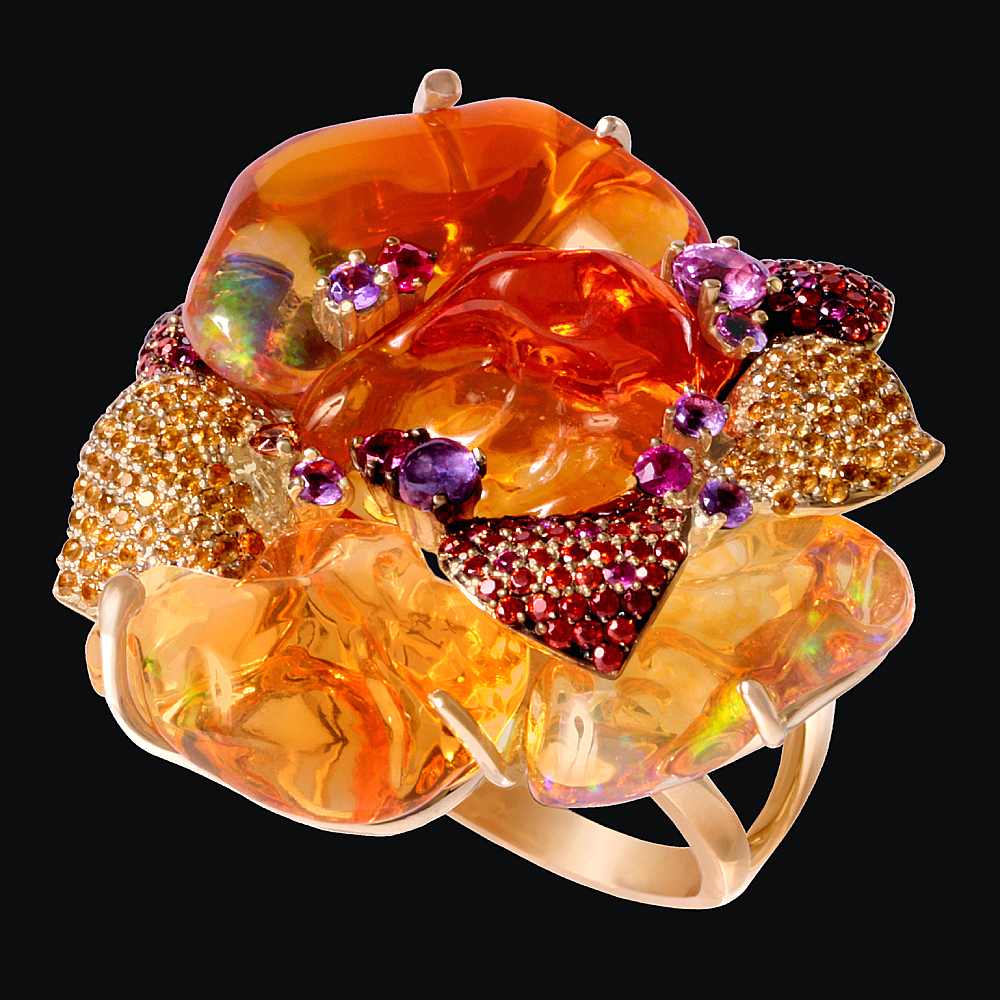 Золото(585), опалы, рубины, сапфиры, гранаты, аметисты, демантоиды.