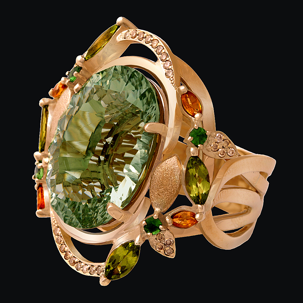 Золото(585), празиолит, хризолиты, сапфиры, тсавориты, бриллианты.