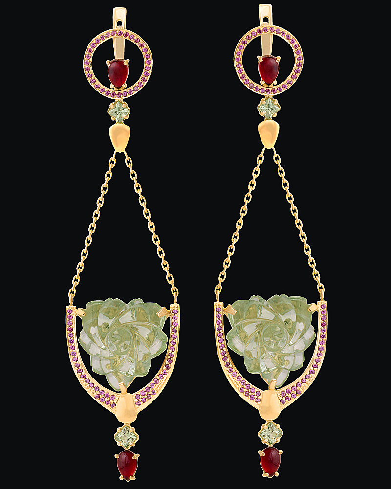 Золото(585), празиолиты, гранаты, сапфиры, родолиты.