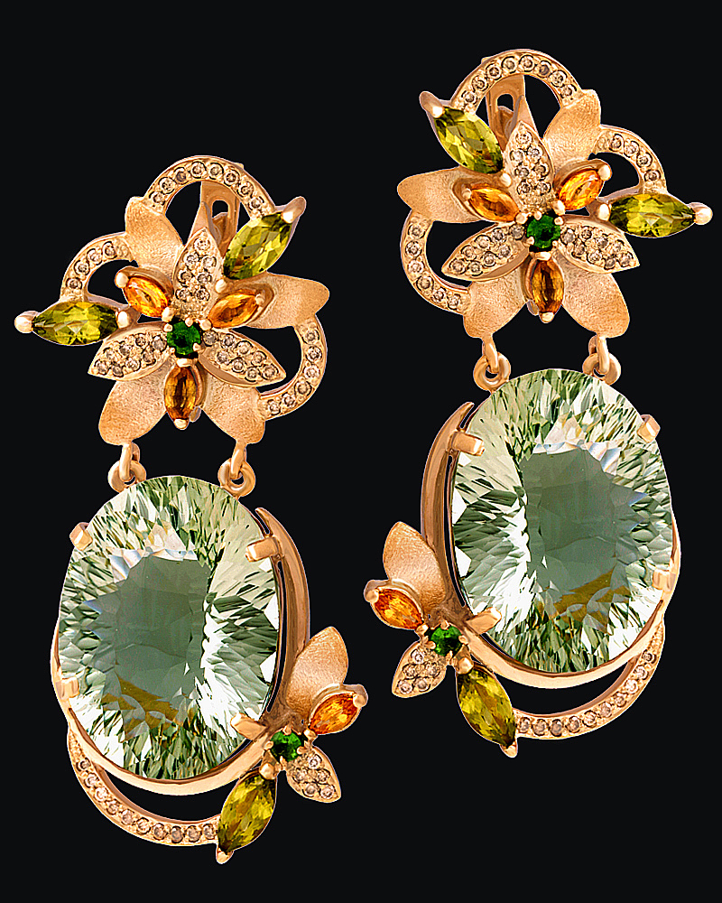 Золото(585), празиолиты, хризолиты, сапфиры, тсавориты, бриллианты.