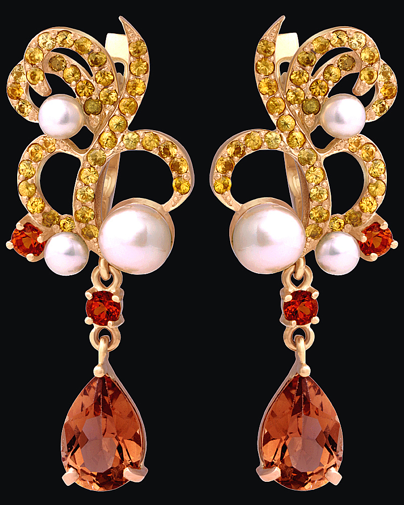 Золото(585), топазы, цитрины, жемчуг, сапфиры.