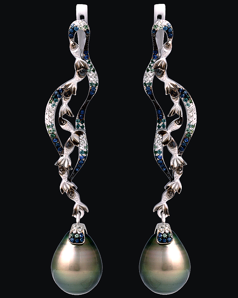Золото(585), жемчуг, сапфиры, бриллианты.