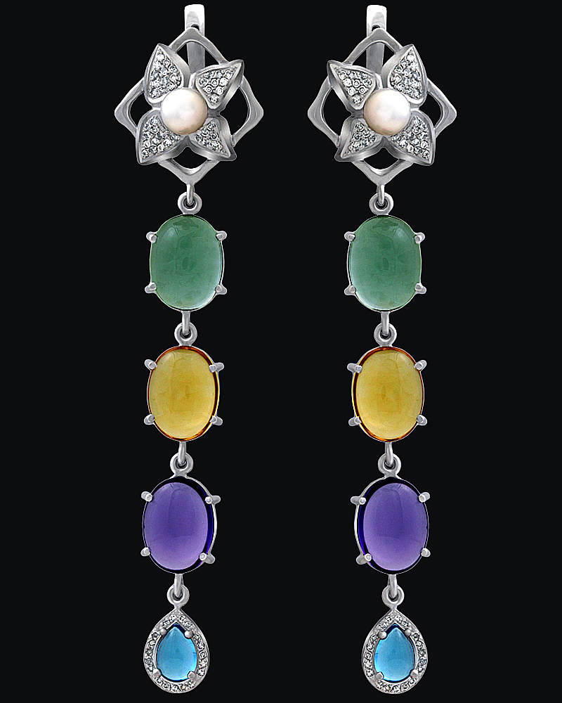 Золото(585), аметисты, цитрины, топазы, бриллианты, жемчуг.