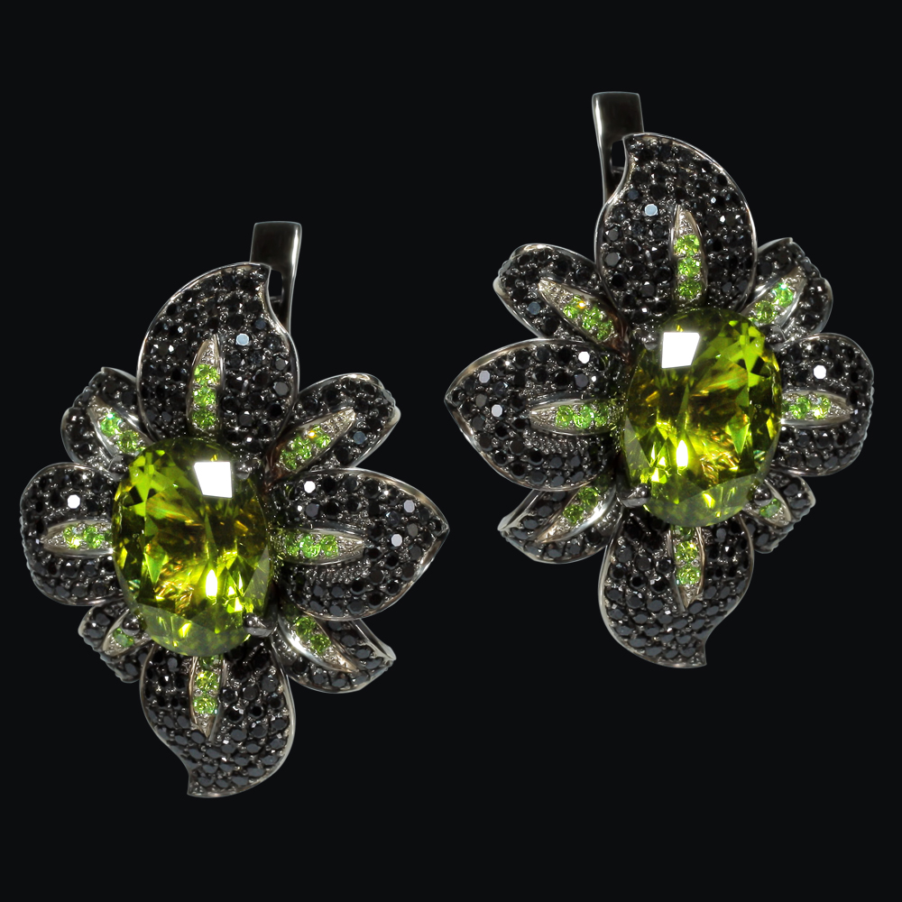 Золото (585), хризолит, демантоиды, черные бриллианты.