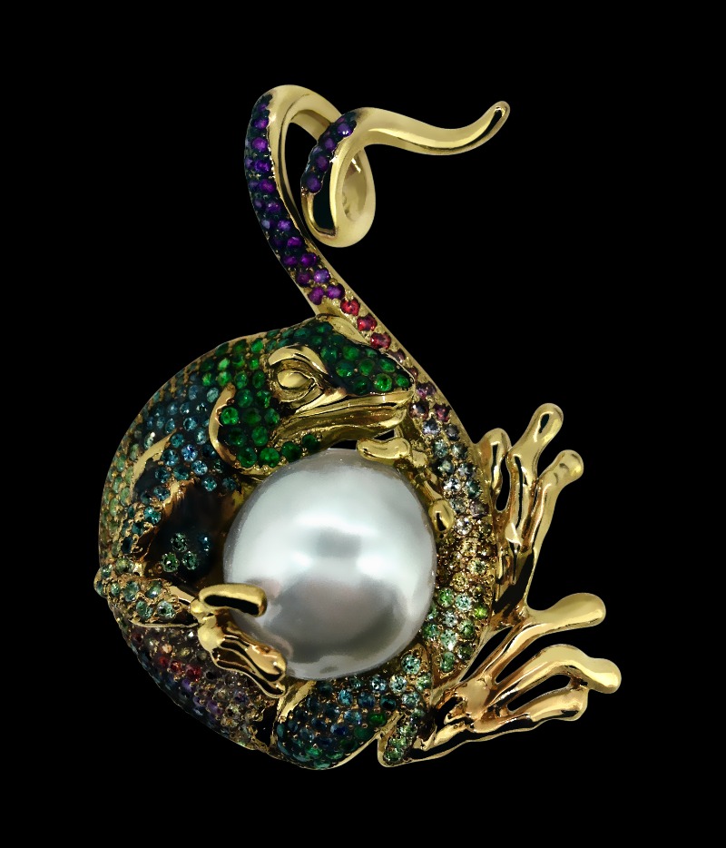 Желтое золото (585), тсавориты, морской жемчуг, цветные сапфиры.