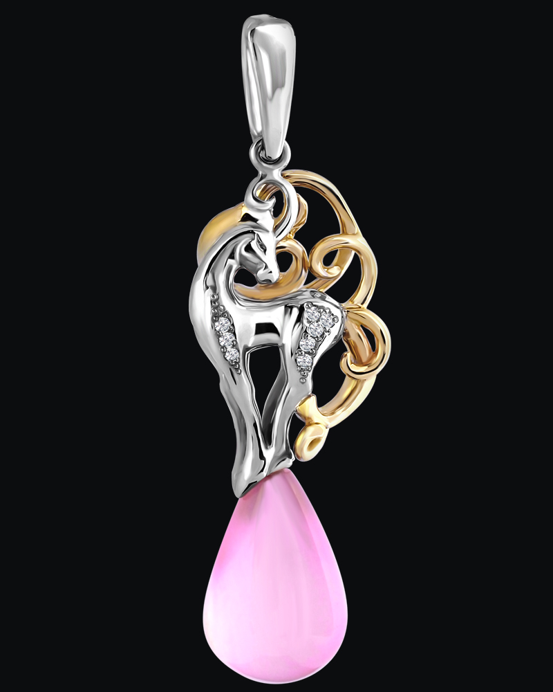 Белое и желтое золото (585), розовый кварц, бриллианты.