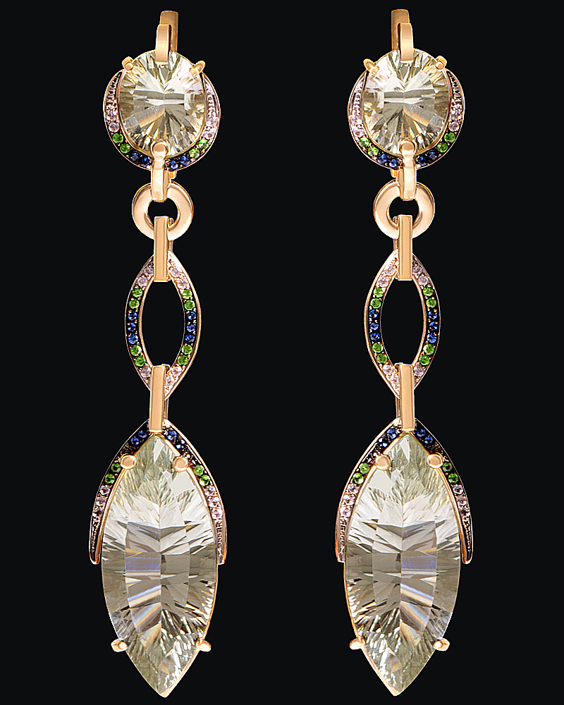 Золото(585), празолиты, топазы, сапфиры, тсавориты.