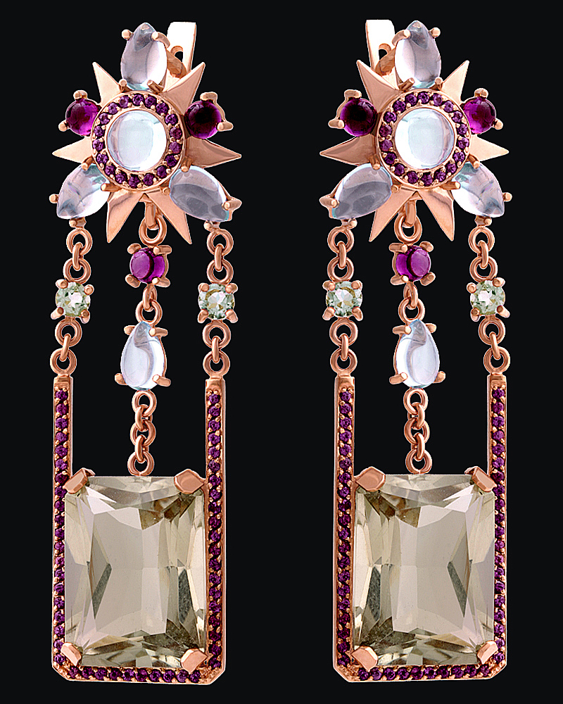 Золото(585), празиолиты, топазы, родолиты.