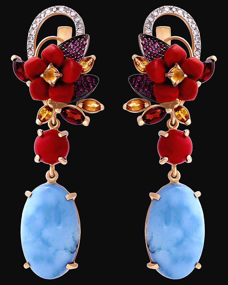 Золото(585), бирюза, коралл, гранаты, цитрины, рубины, сапфиры.