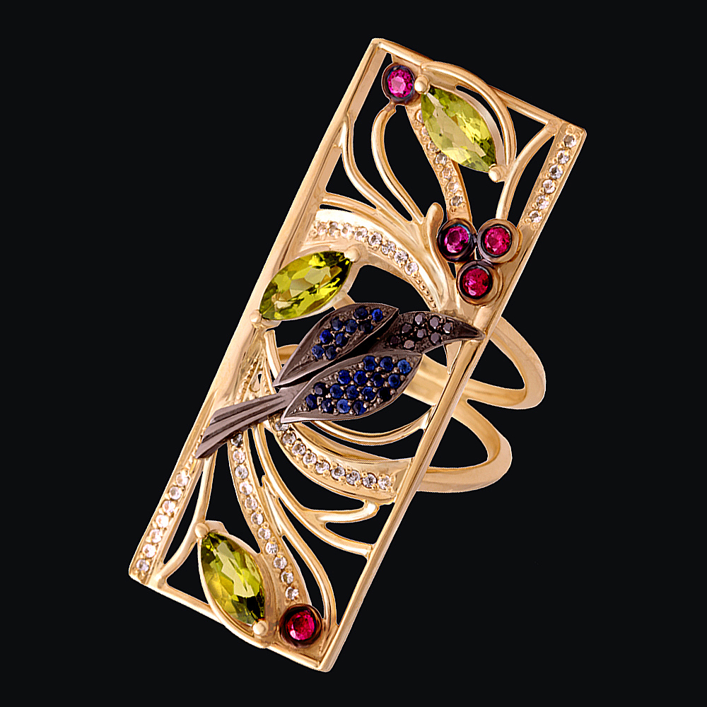 Золото(585), рубины, хризолиты, сапфиры, бриллианты.