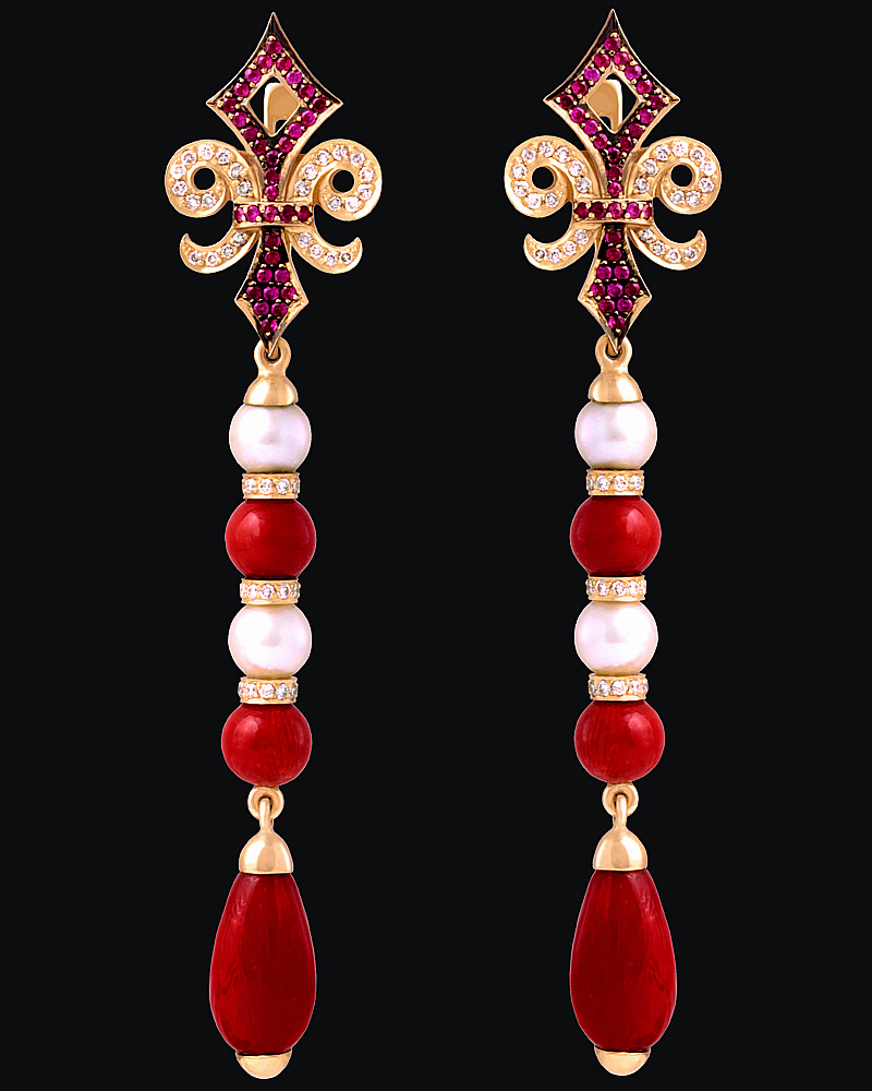 Золото(585), жемчуг, кораллы, рубины, бриллианты.
