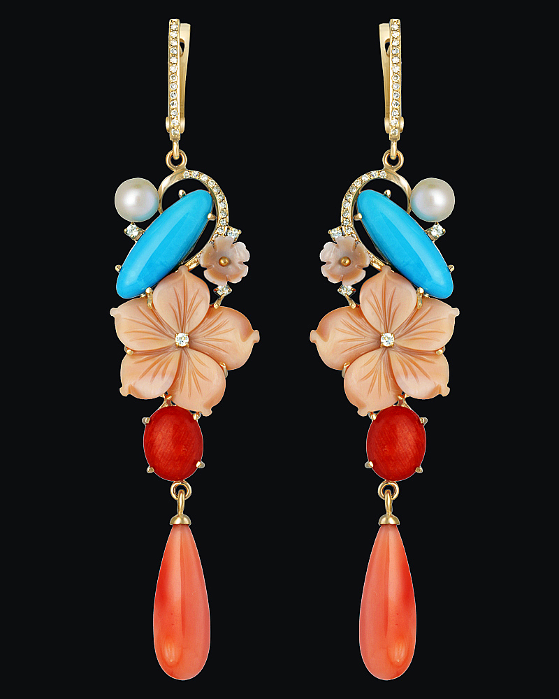 Серьги. Золото(585). Кораллы.Жемчуг. Бирюза. Перламутр. Бриллианты.